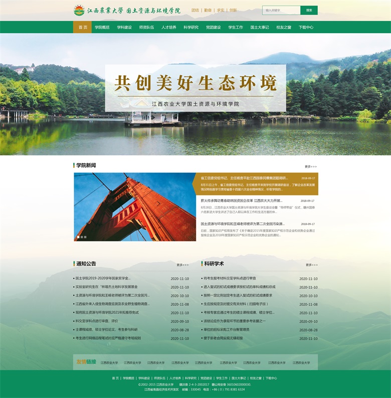 江西農(nóng)業(yè)大學(xué)國土資源與環(huán)境學(xué)院辦學(xué)歷史悠久,最早可追溯到1940年中正大學(xué)的土壤學(xué)和農(nóng)業(yè)化學(xué)學(xué)科,1997年由原資源與環(huán)境系、環(huán)保系和土管系合并而成。學(xué)院下設(shè)黨委行政辦公室、學(xué)生工作辦公室、教學(xué)管理辦公室和資料室等4個(gè)服務(wù)部門,農(nóng)業(yè)資源與環(huán)境系、環(huán)境科學(xué)與工程系、農(nóng)業(yè)水利工程系、土地資源管理系和旅游管理系等5個(gè)教學(xué)單位,以及江西省鄱陽湖流域農(nóng)業(yè)資源與生態(tài)重點(diǎn)實(shí)驗(yàn)室、南昌市景觀與環(huán)境重點(diǎn)實(shí)驗(yàn)室、江西農(nóng)業(yè)大學(xué)農(nóng)業(yè)資源與環(huán)境實(shí)驗(yàn)教學(xué)示范中心、土地資源管理實(shí)驗(yàn)室、資源環(huán)境遙感與信息實(shí)驗(yàn)室和江西農(nóng)業(yè)大學(xué)土地科學(xué)研究所等6個(gè)教學(xué)與科研平臺。 學(xué)院擁有一支初具規(guī)模、結(jié)構(gòu)合理且?guī)煹聡?yán)謹(jǐn)、學(xué)術(shù)優(yōu)良的師資隊(duì)伍。截止2017年8月,學(xué)院現(xiàn)有教職工83人,專任教師61人,其中教授15人,副教授22人,博士生導(dǎo)師6人,博士43人。全國模范教師1 人、享受國務(wù)院政府特殊津貼者2人、“贛鄱英才555 工程”領(lǐng)軍人才2人、江西省優(yōu)秀教師1 人、江西省高等學(xué)校中青年學(xué)科帶頭人6人,江西省新世紀(jì)百千萬人才工程第一、二層次人選5名。同時(shí),對外聘請客座和兼職教授8人。 學(xué)院在強(qiáng)化基礎(chǔ)研究和應(yīng)用基礎(chǔ)研究的基礎(chǔ)上,不斷拓展應(yīng)用研究和社會服務(wù)工作。近年來,承擔(dān)國家自然科學(xué)基金項(xiàng)目、國家社會科學(xué)基金項(xiàng)目、國家“973”子項(xiàng)目、“十三五”國家重點(diǎn)研發(fā)計(jì)劃項(xiàng)目、省部級及市(廳)級各類課題318項(xiàng),發(fā)表論文346篇,出版著作16部,獲國家級、省部級等科技獎勵23項(xiàng),獲專利8項(xiàng),其中一大批科技成果在社會上得以廣泛應(yīng)用,取得良好的經(jīng)濟(jì)效益、社會效益和生態(tài)效益。 雅騰科技根據(jù)學(xué)院的具體需求,進(jìn)行量身定制設(shè)計(jì)、采用寬屏布局、簡潔、大氣、上檔次。 (江西農(nóng)業(yè)大學(xué)國土資源與環(huán)境學(xué)院網(wǎng)站首頁設(shè)計(jì)效果圖) 雅騰科技專注企業(yè)網(wǎng)站建設(shè)、微信小程序、軟件系統(tǒng)、公眾號定制開發(fā),有專業(yè)的技術(shù)團(tuán)隊(duì),為企業(yè)提供高性價(jià)比的技術(shù)開發(fā)支持服務(wù)。